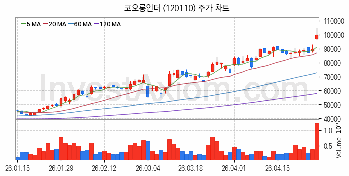 코오롱인더(120110) 종목은 시가 97,000원으로 시작해 100,000원으로 마감했습니다.
