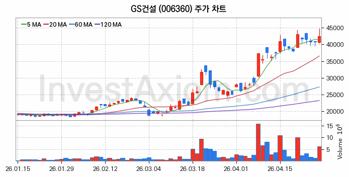 2026년 04월 28일, GS건설 주식 종목(006360)의 주가는 전일(40750원) 대비 1700원(약 4.17%) 상승한 42450원입니다.
