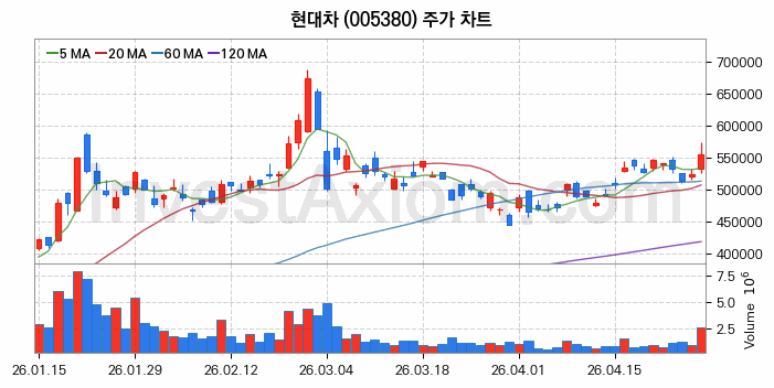 현대차 (주식 종목 코드 : 005380) 주가 분석 내용의 기준 시점은 2026년 04월 28일이며, 분석 기준 시점으로부터의 주가 흐름 및 거래량 데이터를 바탕으로 분석 한 내용입니다.