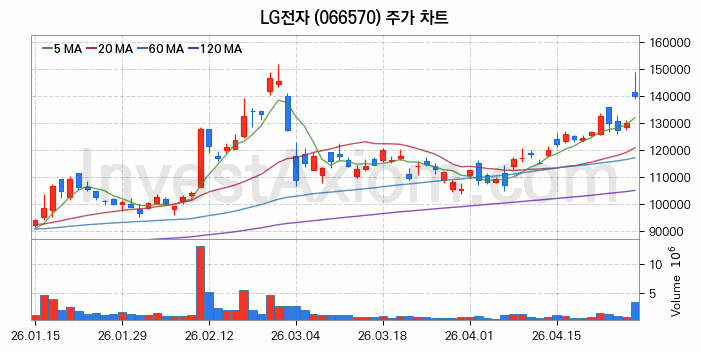 2026년 04월 28일, LG전자 주식 종목(066570)의 주가는 전일(130000원) 대비 10000원(약 7.69%) 상승한 140000원입니다.