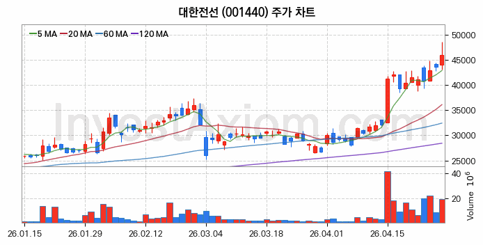 대한전선 (주식 종목 코드 : 001440) 주가 분석 내용의 기준 시점은 2026년 04월 28일이며, 분석 기준 시점으로부터의 주가 흐름 및 거래량 데이터를 바탕으로 분석 한 내용입니다.