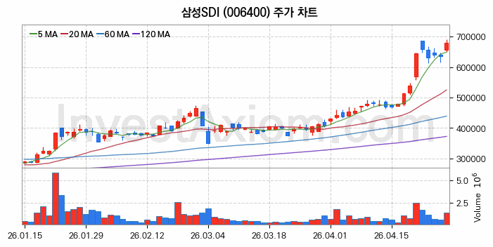 삼성SDI 주가는 주 단위 첫 거래일인 2026년 04월 27일을 기준으로 주초 주가 635000원 대비 약 7.09% 45000원 상승한 상태입니다.