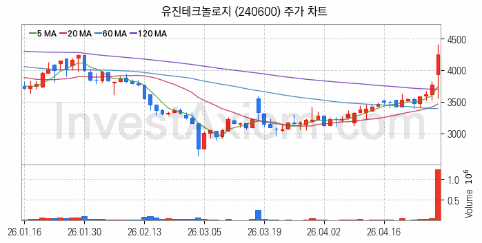 유진테크놀로지(240600) 종목은 시가 3,930원으로 시작해 4,250원으로 마감했습니다.