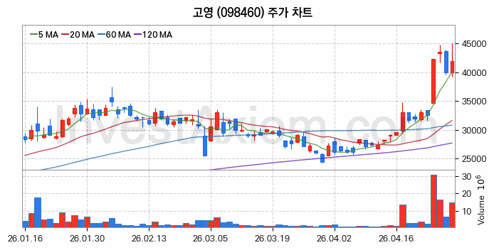 2026년 04월 29일, 고영 주식 종목(098460)의 주가는 전일(39950원) 대비 2000원(약 5.01%) 상승한 41950원입니다.