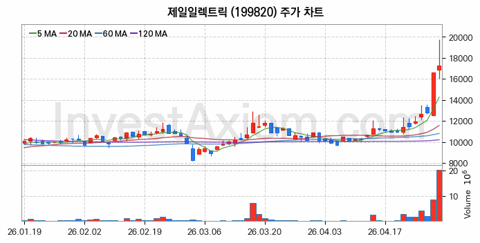 제일일렉트릭 (주식 종목 코드 : 199820) 주가 분석 내용의 기준 시점은 2026년 04월 30일이며, 분석 기준 시점으로부터의 주가 흐름 및 거래량 데이터를 바탕으로 분석 한 내용입니다.
