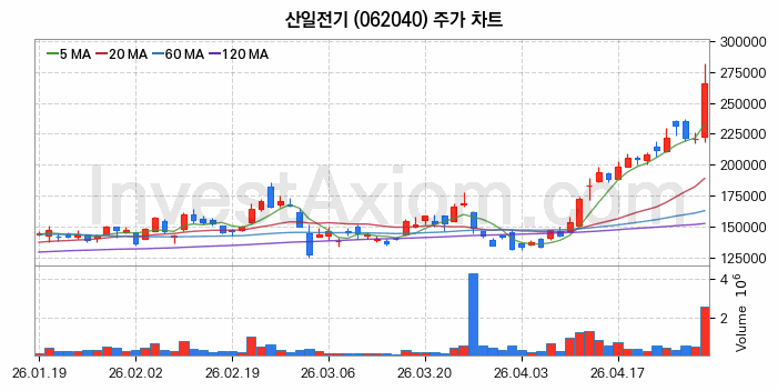 산일전기 (주식 종목 코드 : 062040) 주가 분석 내용의 기준 시점은 2026년 04월 30일이며, 분석 기준 시점으로부터의 주가 흐름 및 거래량 데이터를 바탕으로 분석 한 내용입니다.