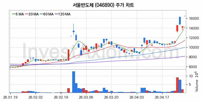 서울반도체 (주식 종목 코드 : 046890) 주가 분석 내용의 기준 시점은 2026년 04월 30일이며, 분석 기준 시점으로부터의 주가 흐름 및 거래량 데이터를 바탕으로 분석 한 내용입니다.