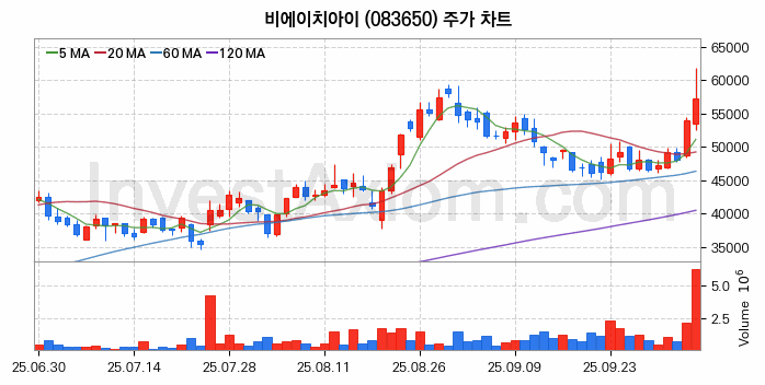 비에이치아이 주가 전망에 참고될 수 있는 상세한 주식 기술적 분석 결과(2025년 10월 13일 기준)를 제공하며, 전 거래일 대비 약 5.93% 상승한 주식시장에 상장된 비에이치아이 주식 종목의 주가 차트를 비롯해 주가 상태, 주식 거래량, 기간 수익률, 주가 이동평균 및 기간 주가 변동성 기반 분석 결과를 제공합니다.