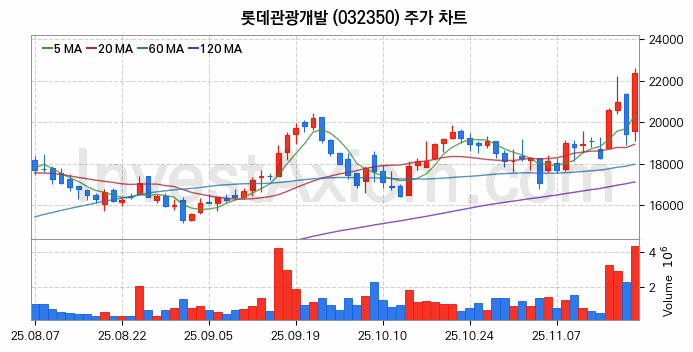 롯데관광개발 주가 전망에 참고될 수 있는 상세한 주식 기술적 분석 결과(2025년 11월 20일 기준)를 제공하며, 전 거래일 대비 약 14.97% 상승한 주식시장에 상장된 롯데관광개발 주식 종목의 주가 차트를 비롯해 주가 상태, 주식 거래량, 기간 수익률, 주가 이동평균 및 기간 주가 변동성 기반 분석 결과를 제공합니다.