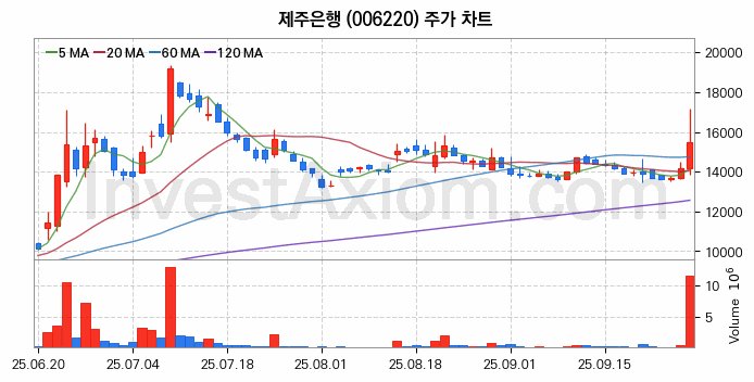제주은행 주가 전망에 참고될 수 있는 상세한 주식 기술적 분석 결과(2025년 09월 26일 기준)를 제공하며, 전 거래일 대비 약 9.03% 상승한 주식시장에 상장된 제주은행 주식 종목의 주가 차트를 비롯해 주가 상태, 주식 거래량, 기간 수익률, 주가 이동평균 및 기간 주가 변동성 기반 분석 결과를 제공합니다.