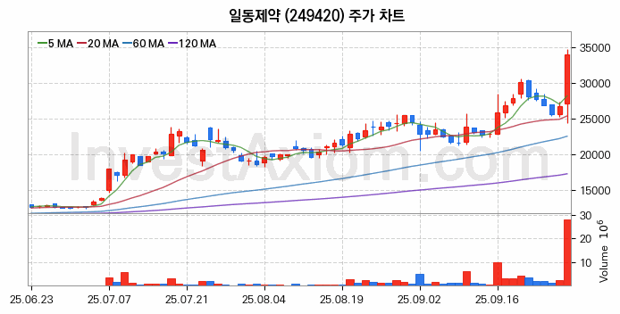 일동제약 주가 전망에 참고될 수 있는 상세한 주식 기술적 분석 결과(2025년 09월 29일 기준)를 제공하며, 전 거래일 대비 약 26.97% 상승한 주식시장에 상장된 일동제약 주식 종목의 주가 차트를 비롯해 주가 상태, 주식 거래량, 기간 수익률, 주가 이동평균 및 기간 주가 변동성 기반 분석 결과를 제공합니다.