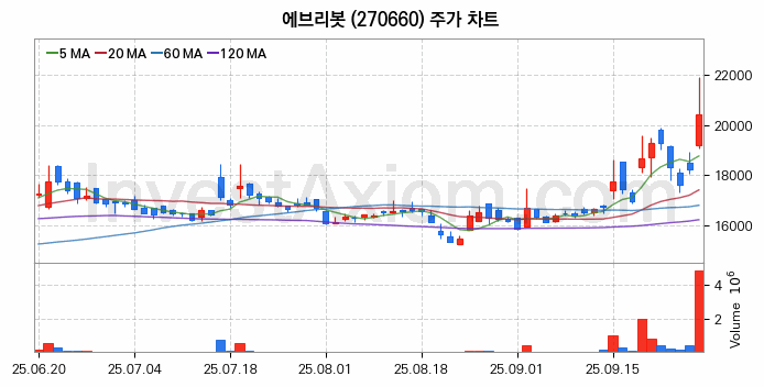 에브리봇 주가 전망에 참고될 수 있는 상세한 주식 기술적 분석 결과(2025년 09월 26일 기준)를 제공하며, 전 거래일 대비 약 11.9% 상승한 주식시장에 상장된 에브리봇 주식 종목의 주가 차트를 비롯해 주가 상태, 주식 거래량, 기간 수익률, 주가 이동평균 및 기간 주가 변동성 기반 분석 결과를 제공합니다.