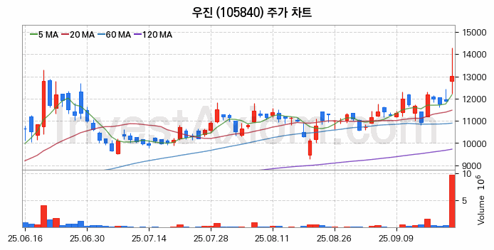 우진 주가 전망 분석, 주식 차트 분석과 기간 수익률 및 주가 변동성 분석 (25년09월22일)