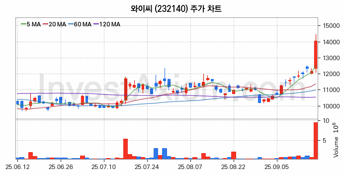 와이씨 주가 전망에 참고될 수 있는 상세한 주식 기술적 분석 결과(2025년 09월 18일 기준)를 제공하며, 전 거래일 대비 약 15.37% 상승한 주식시장에 상장된 와이씨 주식 종목의 주가 차트를 비롯해 주가 상태, 주식 거래량, 기간 수익률, 주가 이동평균 및 기간 주가 변동성 기반 분석 결과를 제공합니다.