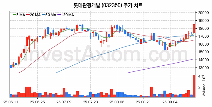롯데관광개발 주가 전망에 참고될 수 있는 상세한 주식 기술적 분석 결과(2025년 09월 17일 기준)를 제공하며, 전 거래일 대비 약 6.38% 상승한 주식시장에 상장된 롯데관광개발 주식 종목의 주가 차트를 비롯해 주가 상태, 주식 거래량, 기간 수익률, 주가 이동평균 및 기간 주가 변동성 기반 분석 결과를 제공합니다.