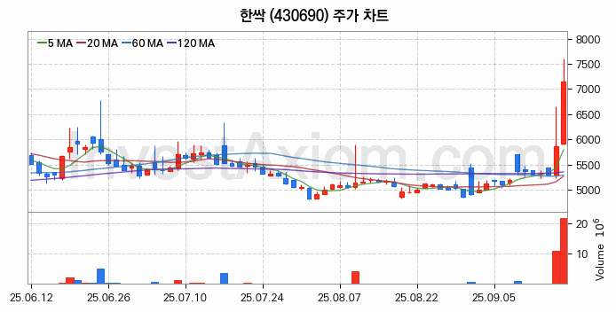 한싹 주가 전망에 참고될 수 있는 상세한 주식 기술적 분석 결과(2025년 09월 18일 기준)를 제공하며, 전 거래일 대비 약 22.01% 상승한 주식시장에 상장된 한싹 주식 종목의 주가 차트를 비롯해 주가 상태, 주식 거래량, 기간 수익률, 주가 이동평균 및 기간 주가 변동성 기반 분석 결과를 제공합니다.