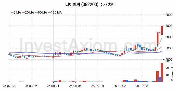 디아이씨 주가 전망에 참고될 수 있는 상세한 주식 기술적 분석 결과(2025년 11월 05일 기준)를 제공하며, 전 거래일 대비 약 10.08% 상승한 주식시장에 상장된 디아이씨 주식 종목의 주가 차트를 비롯해 주가 상태, 주식 거래량, 기간 수익률, 주가 이동평균 및 기간 주가 변동성 기반 분석 결과를 제공합니다.