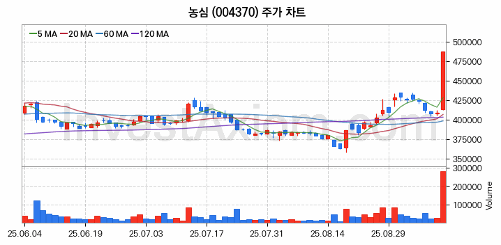 농심 주가 전망 분석, 주식 차트 분석과 기간 수익률 및 주가 변동성 분석 (25년09월11일)