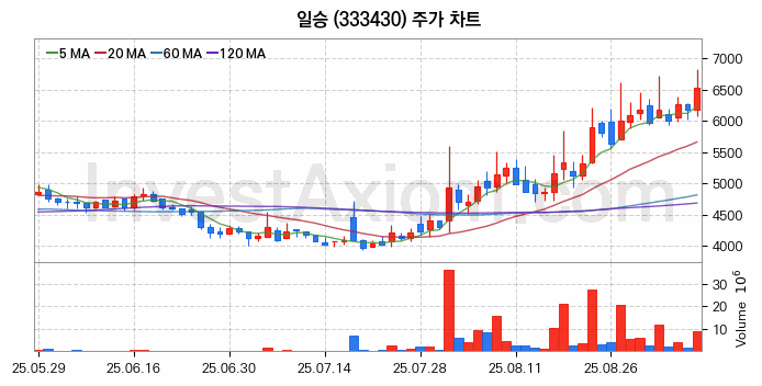 일승 주가 전망에 참고될 수 있는 상세한 주식 기술적 분석 결과(2025년 09월 08일 기준)를 제공하며, 전 거래일 대비 약 5.83% 상승한 주식시장에 상장된 일승 주식 종목의 주가 차트를 비롯해 주가 상태, 주식 거래량, 기간 수익률, 주가 이동평균 및 기간 주가 변동성 기반 분석 결과를 제공합니다.
