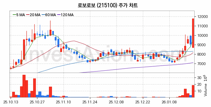 로보로보 주가 전망에 참고될 수 있는 상세한 주식 기술적 분석 결과(2026년 01월 21일 기준)를 제공하며, 전 거래일 대비 약 29.91% 상승한 주식시장에 상장된 로보로보 주식 종목의 주가 차트를 비롯해 주가 상태, 주식 거래량, 기간 수익률, 주가 이동평균 및 기간 주가 변동성 기반 분석 결과를 제공합니다.