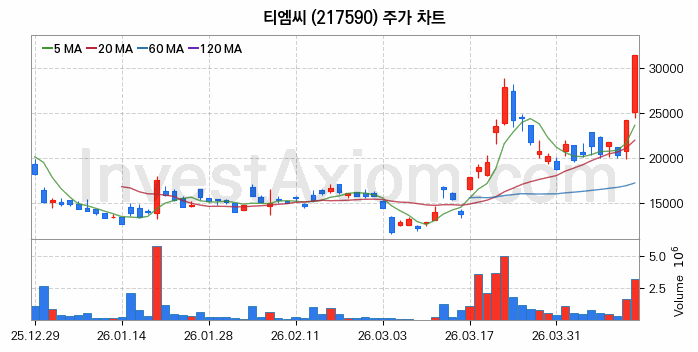 티엠씨 주가 전망에 참고될 수 있는 상세한 주식 기술적 분석 결과(2026년 04월 13일 기준)를 제공하며, 전 거래일 대비 약 29.96% 상승한 주식시장에 상장된 티엠씨 주식 종목의 주가 차트를 비롯해 주가 상태, 주식 거래량, 기간 수익률, 주가 이동평균 및 기간 주가 변동성 기반 분석 결과를 제공합니다.