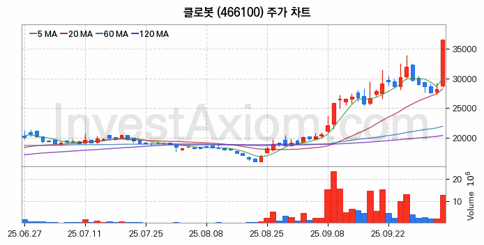 클로봇 주가 전망에 참고될 수 있는 상세한 주식 기술적 분석 결과(2025년 10월 10일 기준)를 제공하며, 전 거래일 대비 약 29.84% 상승한 주식시장에 상장된 클로봇 주식 종목의 주가 차트를 비롯해 주가 상태, 주식 거래량, 기간 수익률, 주가 이동평균 및 기간 주가 변동성 기반 분석 결과를 제공합니다.