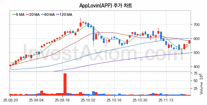 AppLovin (앱플로빈 Class A) 주가 전망에 참고될 수 있는 상세한 주식 기술적 분석 결과(2025년 11월 26일 기준)를 제공하며, 전 거래일 대비 약 5.46% 상승한 미국 주식시장에 상장된 AppLovin 주식 종목의 주가 차트를 비롯해 주가 상태, 주식 거래량, 기간 수익률, 주가 이동평균 및 기간 주가 변동성 기반 분석 결과를 제공합니다.