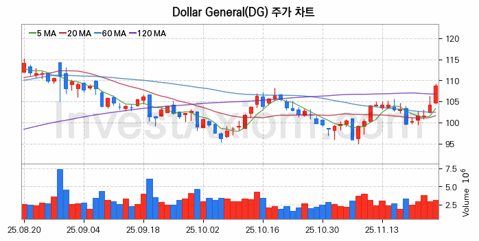 Dollar General (달러 제너럴) 주가 전망에 참고될 수 있는 상세한 주식 기술적 분석 결과(2025년 11월 26일 기준)를 제공하며, 전 거래일 대비 약 4.28% 상승한 미국 주식시장에 상장된 Dollar General 주식 종목의 주가 차트를 비롯해 주가 상태, 주식 거래량, 기간 수익률, 주가 이동평균 및 기간 주가 변동성 기반 분석 결과를 제공합니다.