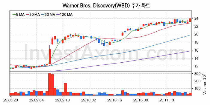 Warner Bros. Discovery (워너 브로스 디스커버리 시리즈 A) 주가 전망에 참고될 수 있는 상세한 주식 기술적 분석 결과(2025년 11월 26일 기준)를 제공하며, 전 거래일 대비 약 4.01% 상승한 미국 주식시장에 상장된 Warner Bros. Discovery 주식 종목의 주가 차트를 비롯해 주가 상태, 주식 거래량, 기간 수익률, 주가 이동평균 및 기간 주가 변동성 기반 분석 결과를 제공합니다.