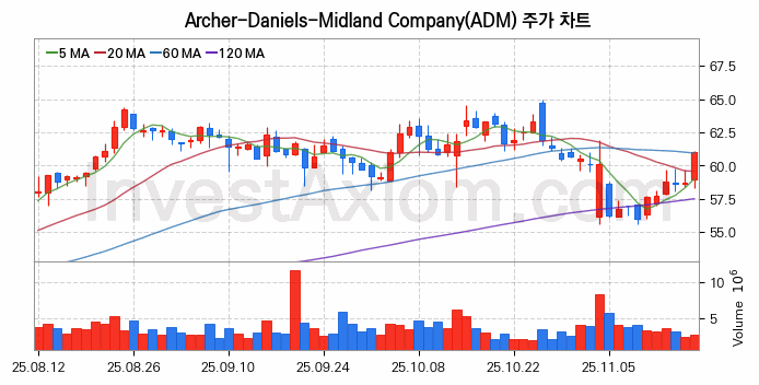 미국 주식 분석, Archer-Daniels-Midland Company (아처 대니얼스 미들랜드) 주가 차트 분석과 주식 기간 수익률 및 변동성 분석 (2025-11-18)