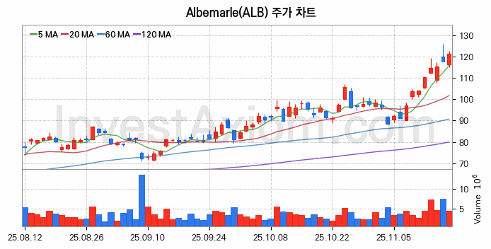Albemarle (앨버말) 주가 전망에 참고될 수 있는 상세한 주식 기술적 분석 결과(2025년 11월 18일 기준)를 제공하며, 전 거래일 대비 약 3.14% 상승한 미국 주식시장에 상장된 Albemarle 주식 종목의 주가 차트를 비롯해 주가 상태, 주식 거래량, 기간 수익률, 주가 이동평균 및 기간 주가 변동성 기반 분석 결과를 제공합니다.