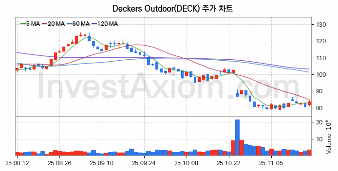 미국 주식 분석, Deckers Outdoor (덱커 아웃도어) 주가 차트 분석과 주식 기간 수익률 및 변동성 분석 (2025-11-18)