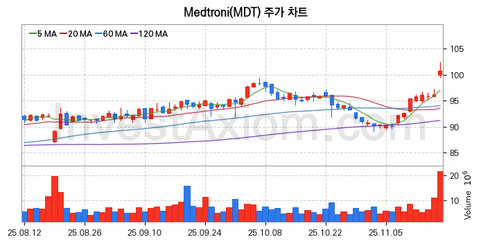 Medtroni (메드트로닉) 주가 전망에 참고될 수 있는 상세한 주식 기술적 분석 결과(2025년 11월 18일 기준)를 제공하며, 전 거래일 대비 약 4.69% 상승한 미국 주식시장에 상장된 Medtroni 주식 종목의 주가 차트를 비롯해 주가 상태, 주식 거래량, 기간 수익률, 주가 이동평균 및 기간 주가 변동성 기반 분석 결과를 제공합니다.