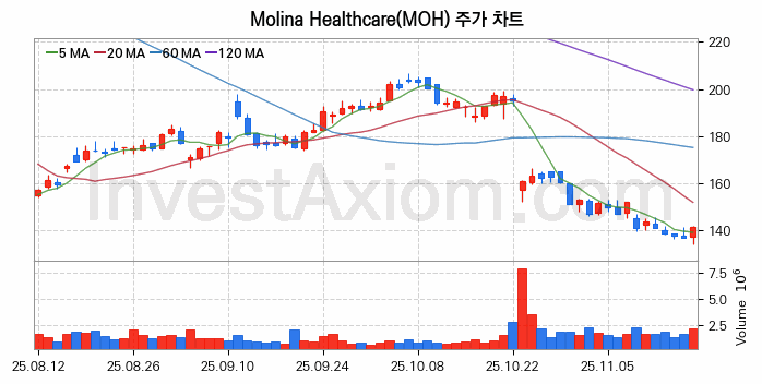Molina Healthcare (몰리나 헬스케어) 주가 전망에 참고될 수 있는 상세한 주식 기술적 분석 결과(2025년 11월 18일 기준)를 제공하며, 전 거래일 대비 약 3.22% 상승한 미국 주식시장에 상장된 Molina Healthcare 주식 종목의 주가 차트를 비롯해 주가 상태, 주식 거래량, 기간 수익률, 주가 이동평균 및 기간 주가 변동성 기반 분석 결과를 제공합니다.