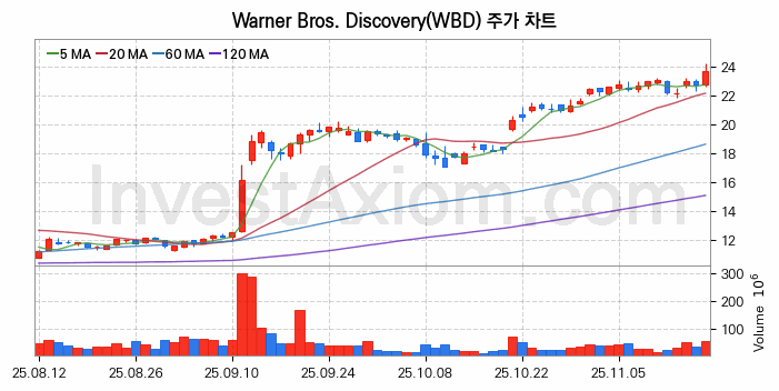 Warner Bros. Discovery (워너 브로스 디스커버리 시리즈 A) 주가 전망에 참고될 수 있는 상세한 주식 기술적 분석 결과(2025년 11월 18일 기준)를 제공하며, 전 거래일 대비 약 4.18% 상승한 미국 주식시장에 상장된 Warner Bros. Discovery 주식 종목의 주가 차트를 비롯해 주가 상태, 주식 거래량, 기간 수익률, 주가 이동평균 및 기간 주가 변동성 기반 분석 결과를 제공합니다.