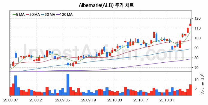 미국 주식 분석, Albemarle (앨버말) 주가 차트 분석과 주식 기간 수익률 및 변동성 분석 (2025-11-13)