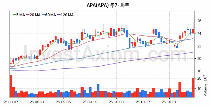 APA (APA (US)) 주가 전망에 참고될 수 있는 상세한 주식 기술적 분석 결과(2025년 11월 13일 기준)를 제공하며, 전 거래일 대비 약 3.35% 상승한 미국 주식시장에 상장된 APA 주식 종목의 주가 차트를 비롯해 주가 상태, 주식 거래량, 기간 수익률, 주가 이동평균 및 기간 주가 변동성 기반 분석 결과를 제공합니다.