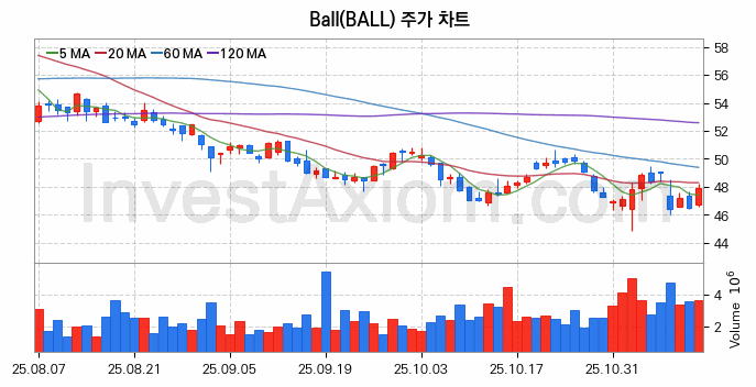 미국 주식 분석, Ball (볼) 주가 차트 분석과 주식 기간 수익률 및 변동성 분석 (2025-11-13)