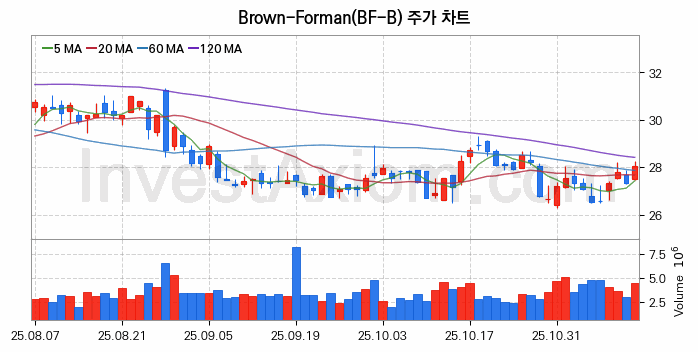 미국 주식 분석, Brown-Forman (브라운-포맨 Class B) 주가 차트 분석과 주식 기간 수익률 및 변동성 분석 (2025-11-13)