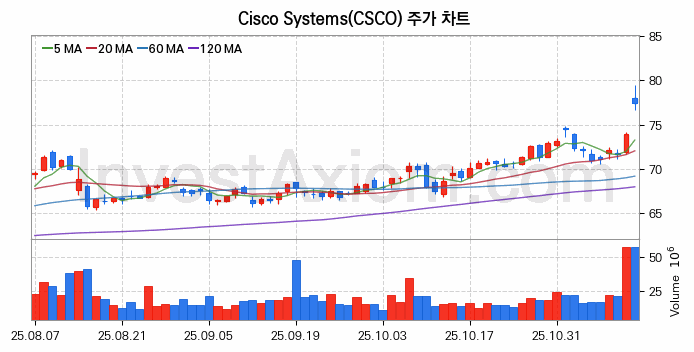 Cisco Systems (시스코 시스템즈) 주가 전망에 참고될 수 있는 상세한 주식 기술적 분석 결과(2025년 11월 13일 기준)를 제공하며, 전 거래일 대비 약 4.62% 상승한 미국 주식시장에 상장된 Cisco Systems 주식 종목의 주가 차트를 비롯해 주가 상태, 주식 거래량, 기간 수익률, 주가 이동평균 및 기간 주가 변동성 기반 분석 결과를 제공합니다.