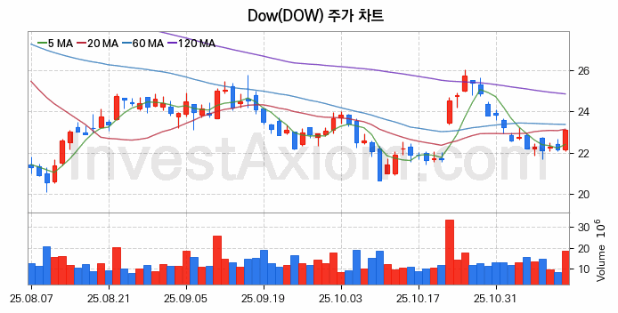 미국 주식 분석, Dow (다우) 주가 차트 분석과 주식 기간 수익률 및 변동성 분석 (2025-11-13)