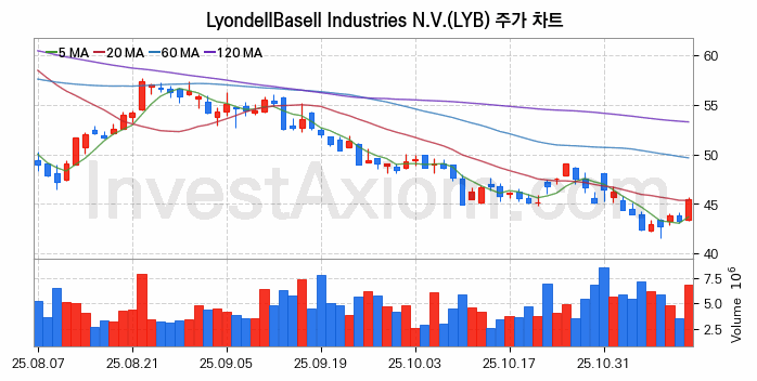 LyondellBasell Industries N.V. (라이온델바젤 인더스트리스 Class A) 주가 전망에 참고될 수 있는 상세한 주식 기술적 분석 결과(2025년 11월 13일 기준)를 제공하며, 전 거래일 대비 약 5.1% 상승한 미국 주식시장에 상장된 LyondellBasell Industries N.V. 주식 종목의 주가 차트를 비롯해 주가 상태, 주식 거래량, 기간 수익률, 주가 이동평균 및 기간 주가 변동성 기반 분석 결과를 제공합니다.