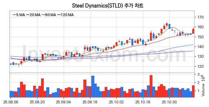 Steel Dynamics (스틸 다이내믹스) 주가 전망에 참고될 수 있는 상세한 주식 기술적 분석 결과(2025년 11월 12일 기준)를 제공하며, 전 거래일 대비 약 3.59% 상승한 미국 주식시장에 상장된 Steel Dynamics 주식 종목의 주가 차트를 비롯해 주가 상태, 주식 거래량, 기간 수익률, 주가 이동평균 및 기간 주가 변동성 기반 분석 결과를 제공합니다.