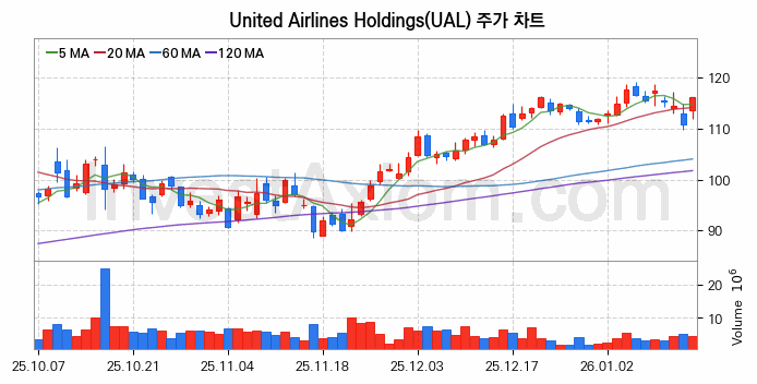 미국 주식 분석, United Airlines Holdings (유나이티드 에어라인스 홀딩스) 주가 차트 분석과 주식 기간 수익률 및 변동성 분석 (2026-01-15)