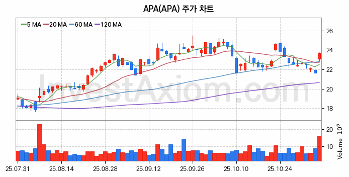 APA (APA (US)) 주가 전망에 참고될 수 있는 상세한 주식 기술적 분석 결과(2025년 11월 06일 기준)를 제공하며, 전 거래일 대비 약 9.14% 상승한 미국 주식시장에 상장된 APA 주식 종목의 주가 차트를 비롯해 주가 상태, 주식 거래량, 기간 수익률, 주가 이동평균 및 기간 주가 변동성 기반 분석 결과를 제공합니다.
