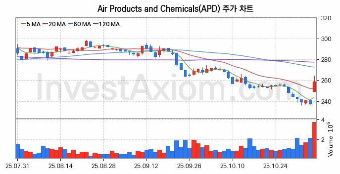 Air Products and Chemicals (에어 프로덕츠 앤 케미컬스) 주가 전망에 참고될 수 있는 상세한 주식 기술적 분석 결과(2025년 11월 06일 기준)를 제공하며, 전 거래일 대비 약 8.94% 상승한 미국 주식시장에 상장된 Air Products and Chemicals 주식 종목의 주가 차트를 비롯해 주가 상태, 주식 거래량, 기간 수익률, 주가 이동평균 및 기간 주가 변동성 기반 분석 결과를 제공합니다.