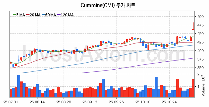 미국 주식 분석, Cummins (커민스) 주가 차트 분석과 주식 기간 수익률 및 변동성 분석 (2025-11-06)