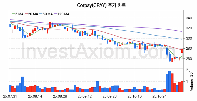 미국 주식 분석, Corpay (콜페이) 주가 차트 분석과 주식 기간 수익률 및 변동성 분석 (2025-11-06)