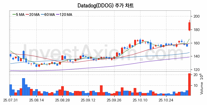 Datadog (데이터도그 Class A) 주가 전망에 참고될 수 있는 상세한 주식 기술적 분석 결과(2025년 11월 06일 기준)를 제공하며, 전 거래일 대비 약 23.13% 상승한 미국 주식시장에 상장된 Datadog 주식 종목의 주가 차트를 비롯해 주가 상태, 주식 거래량, 기간 수익률, 주가 이동평균 및 기간 주가 변동성 기반 분석 결과를 제공합니다.
