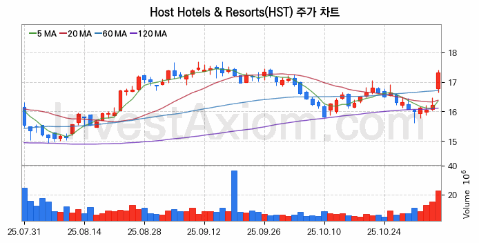 Host Hotels & Resorts (호스트 호텔스 & 리조트) 주가 전망에 참고될 수 있는 상세한 주식 기술적 분석 결과(2025년 11월 06일 기준)를 제공하며, 전 거래일 대비 약 6.85% 상승한 미국 주식시장에 상장된 Host Hotels & Resorts 주식 종목의 주가 차트를 비롯해 주가 상태, 주식 거래량, 기간 수익률, 주가 이동평균 및 기간 주가 변동성 기반 분석 결과를 제공합니다.